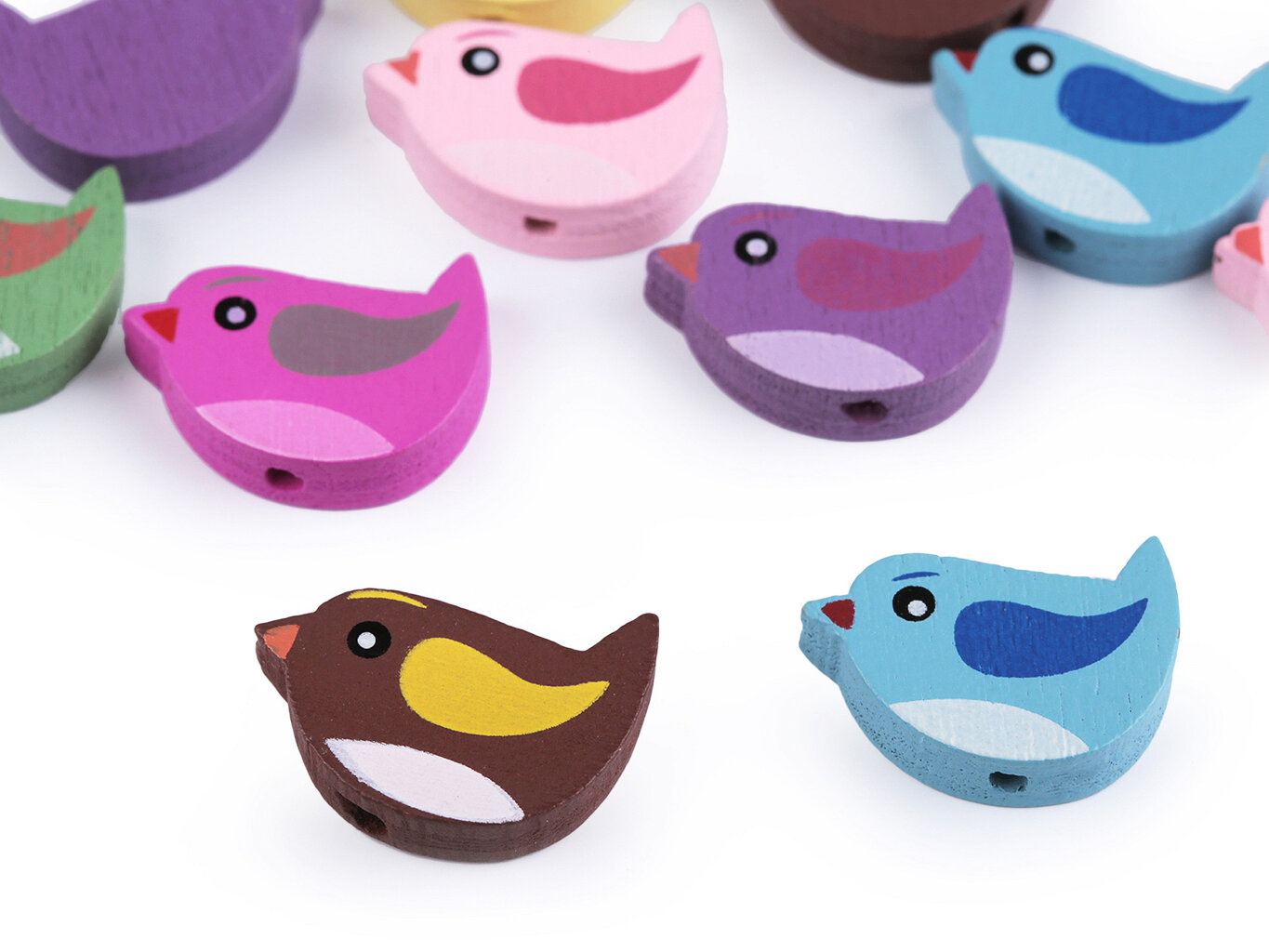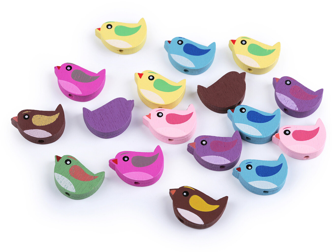 Dekorační barevné korálky s motivem ptáčka vyrobené ze dřeva s dírkou na navlékání. Korálky můžete navlékat i lepit a jsou skvělé na všelijaké dekorativní tvoření.