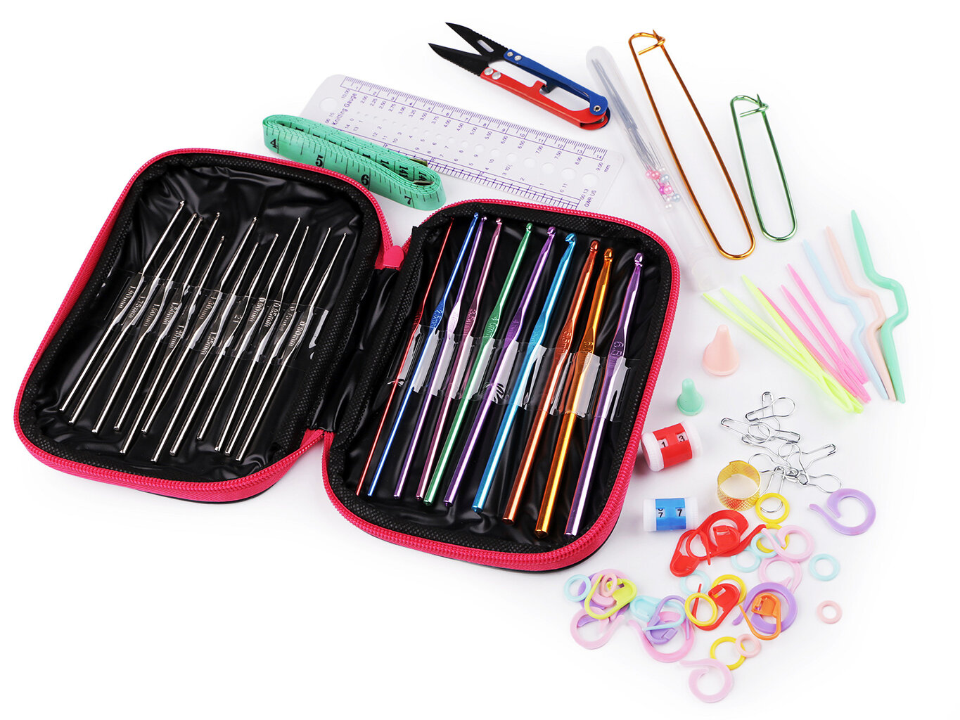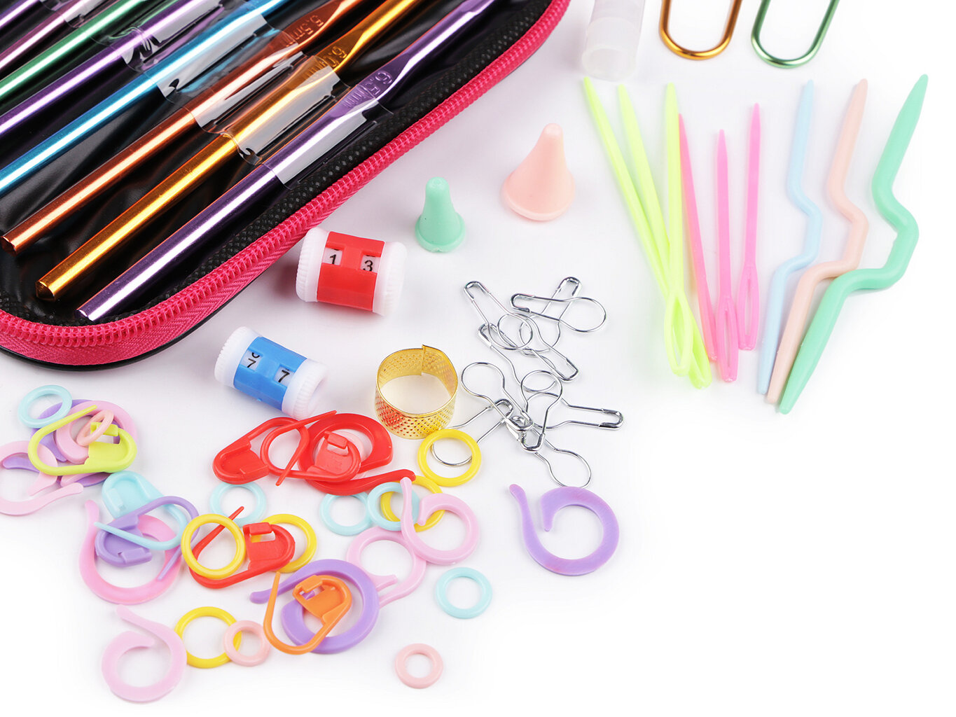 Sada dále obsahuje: nůžky cvakačky, pravítko, počítadlo řad, 2 ks pomocných spínacích špendlíků, balení 10 ks malých spínacích špendlíků, 3 ks plastových pomocných jehlic, 6 ks plastových jehel, 10 ks špendlíků s plastovou hlavičkou, 3 ks kovových jehel na vlnu, oboustranný krejčovský metr (150 cm), kovový náprstek, 2 ks koncovek na háčky a sada plastových kroužků a spínacích špendlíků na označování řad.