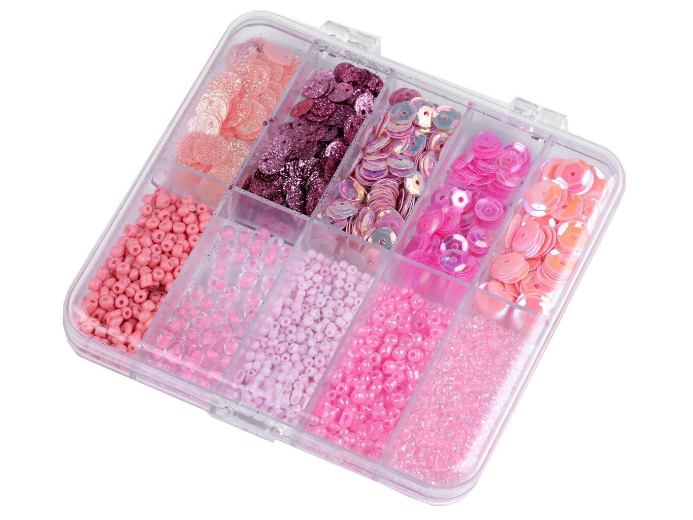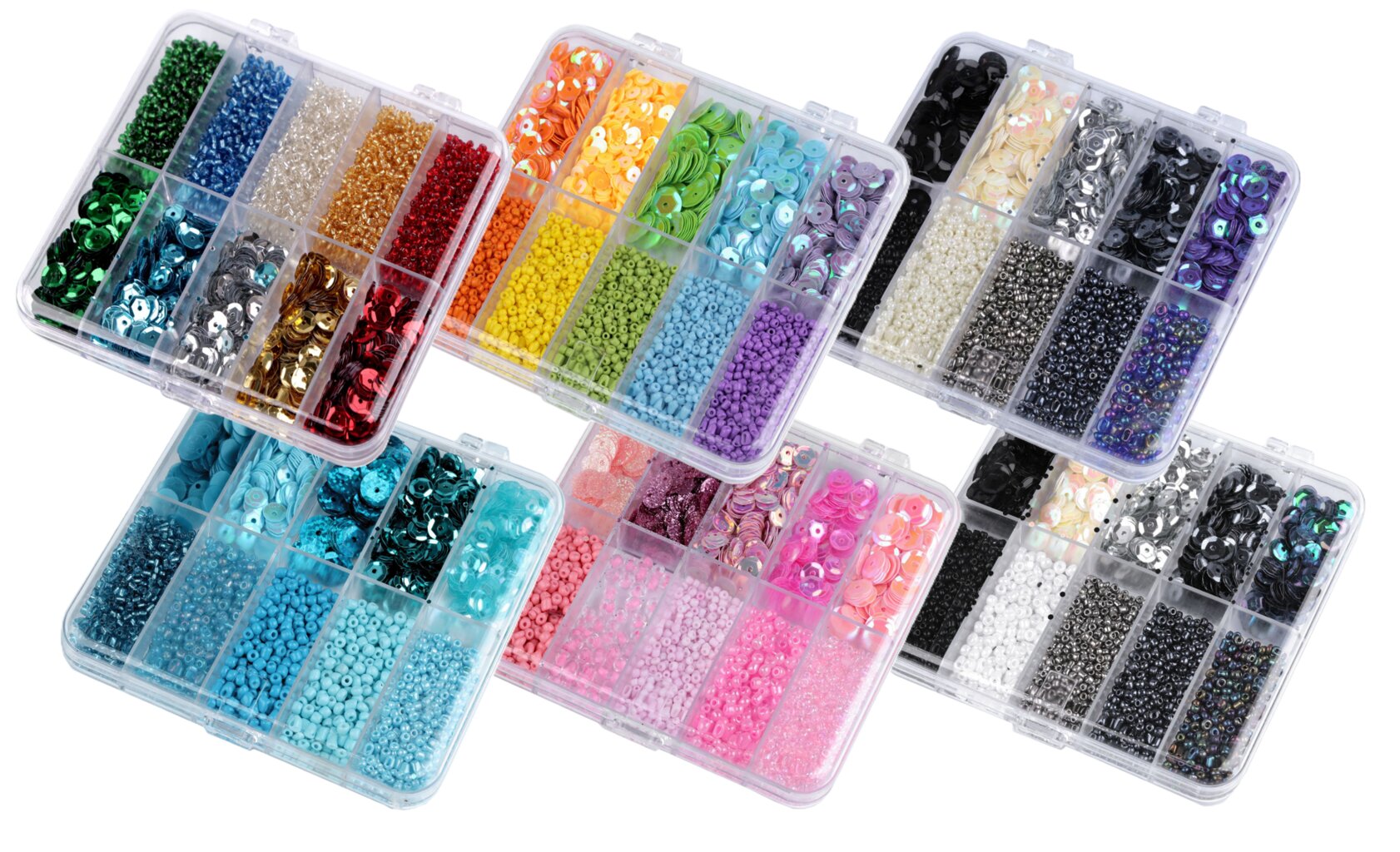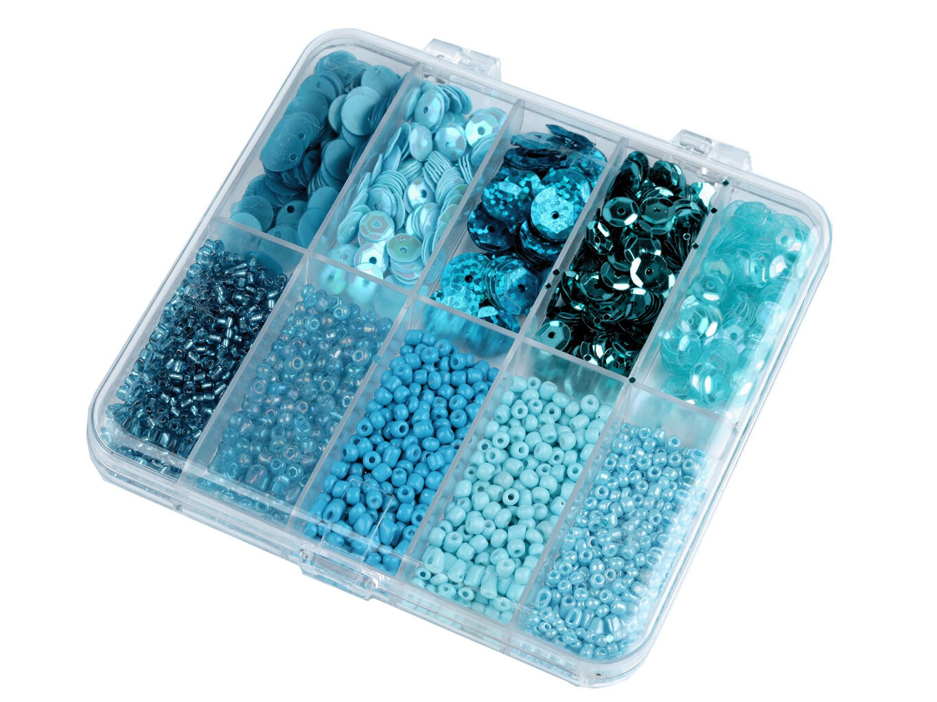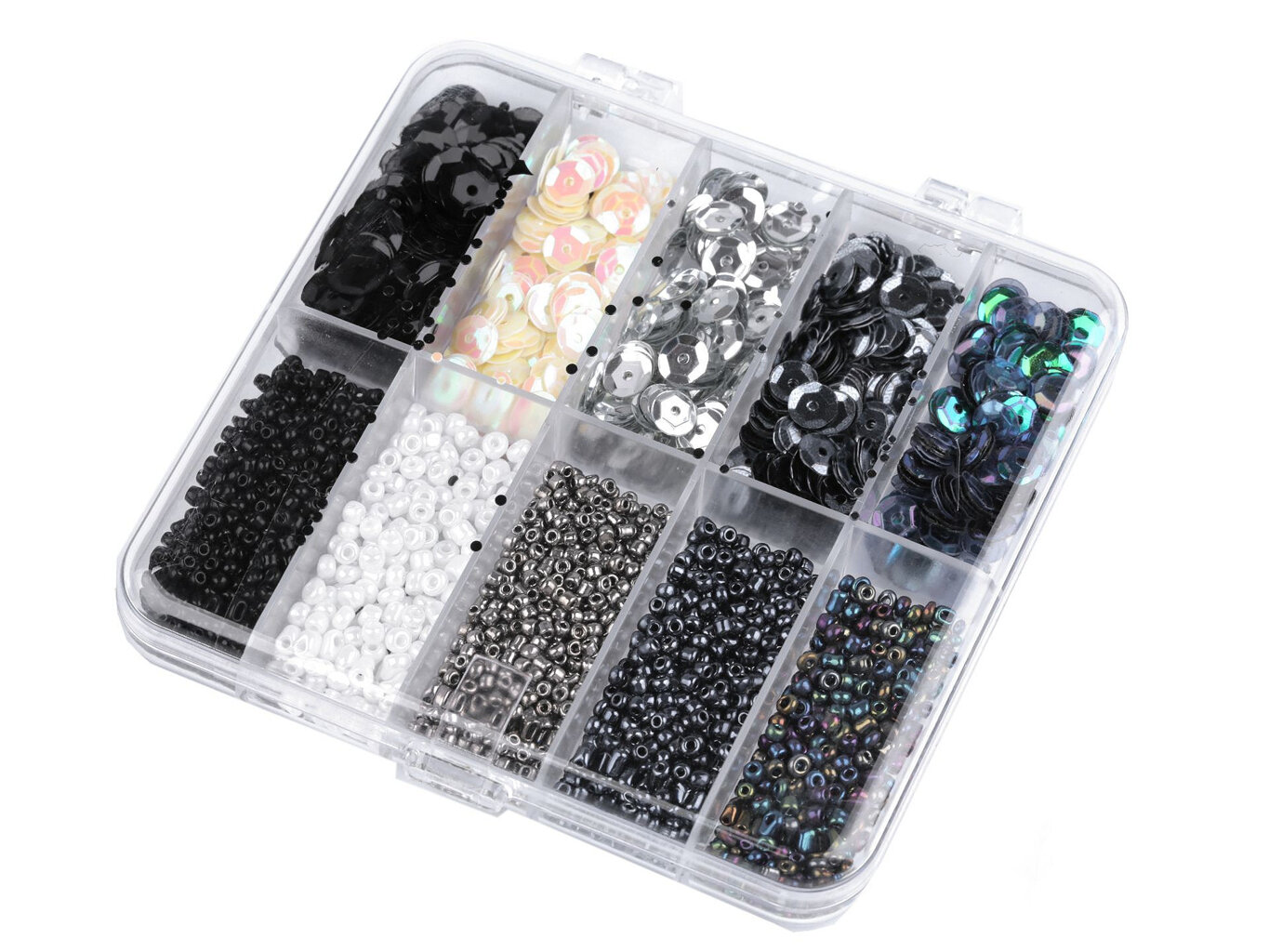 Box obsahuje 5 přihrádek s flitry o průměru cca 6,5 mm a 5 přihrádek s rokajlem velikosti cca 10/0 (2,3 mm)