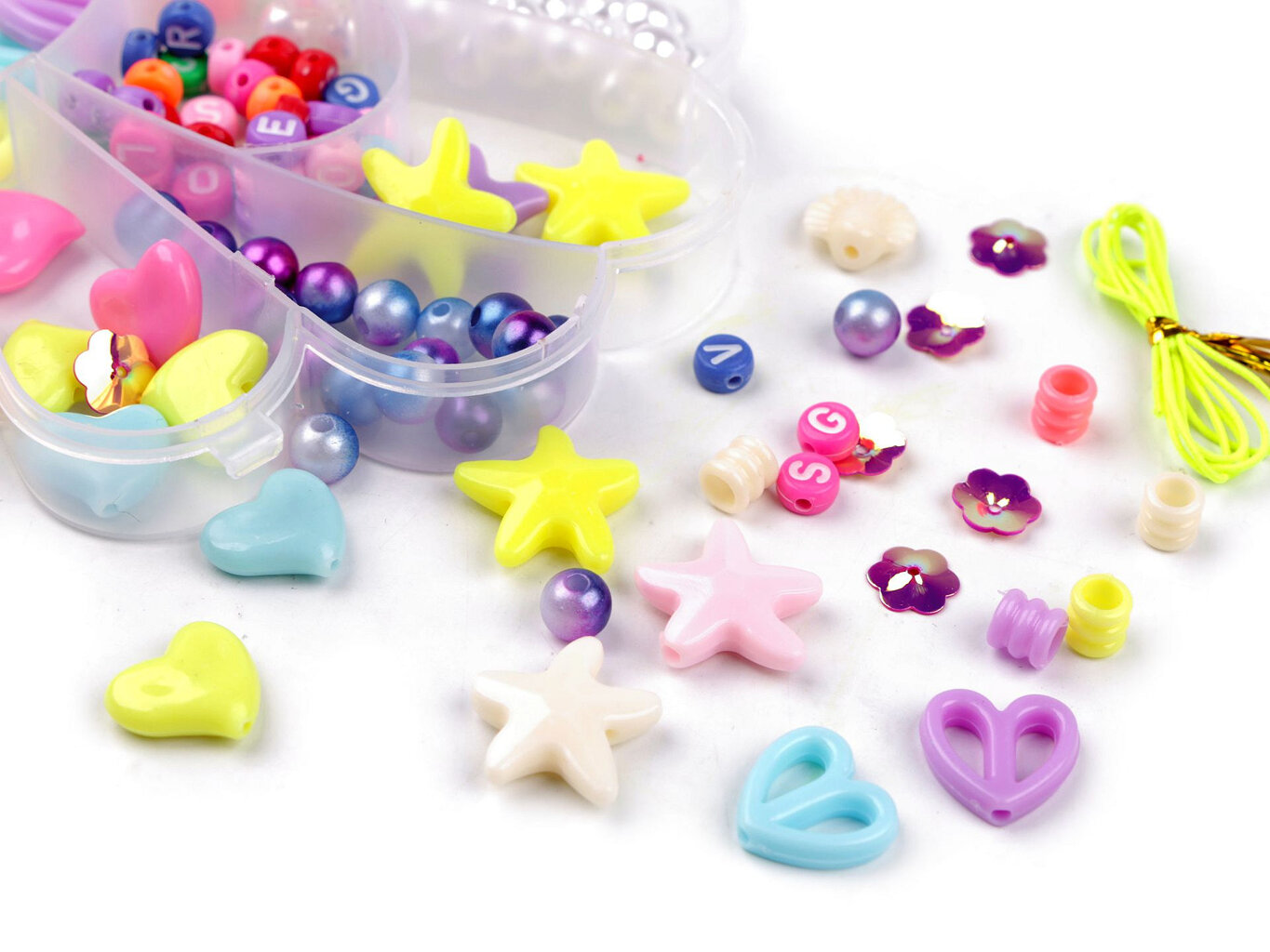 Kreativní sada korálků s pruženkou v praktickém boxu je ideální pro výrobu náramků, náhrdelníků i dalších šperků. Obsahuje pestrý mix barevných korálků různých tvarů a velikostí, které podporují dětskou fantazii i jemnou motoriku.