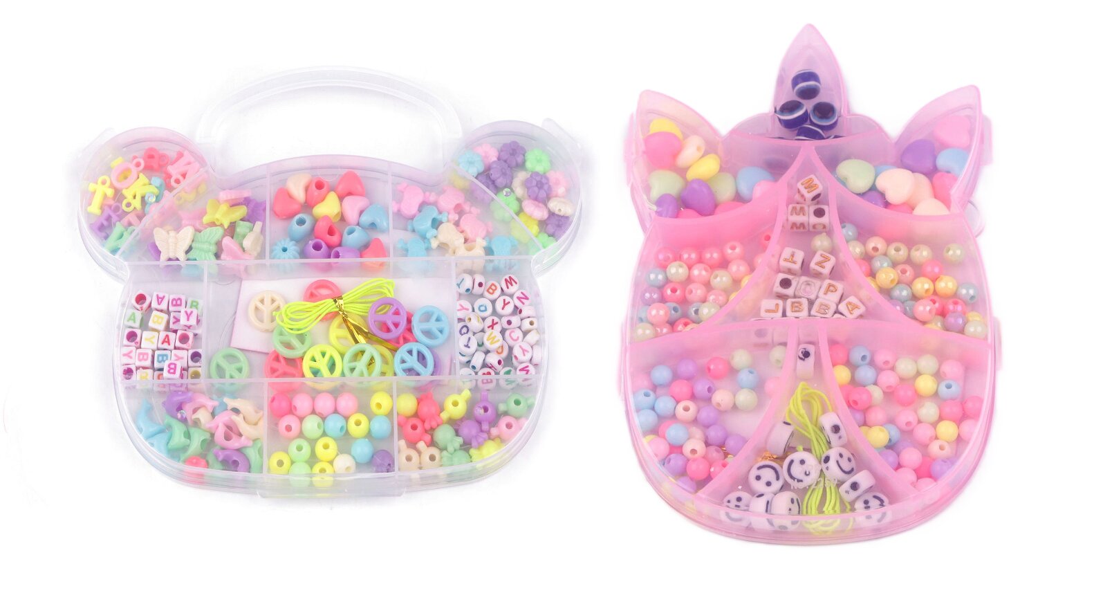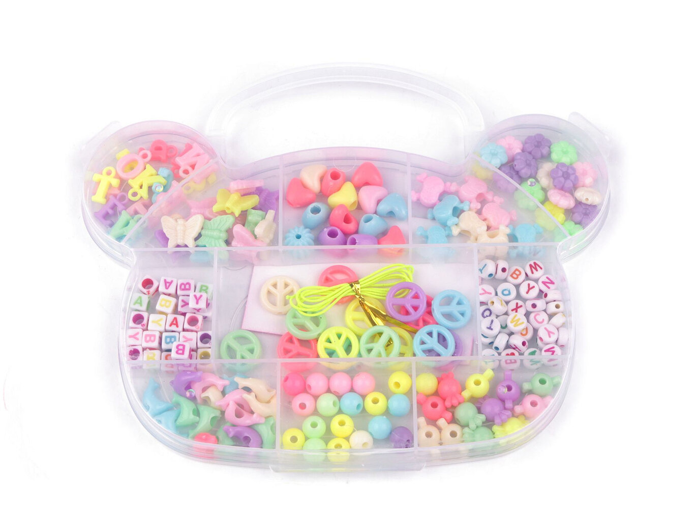 Sada korálků v různém provedení a pruženky v krásném a přehledném boxu ve tvaru medvídka nebo jednorožce. Krásná sada navlékacích korálků pro děti.