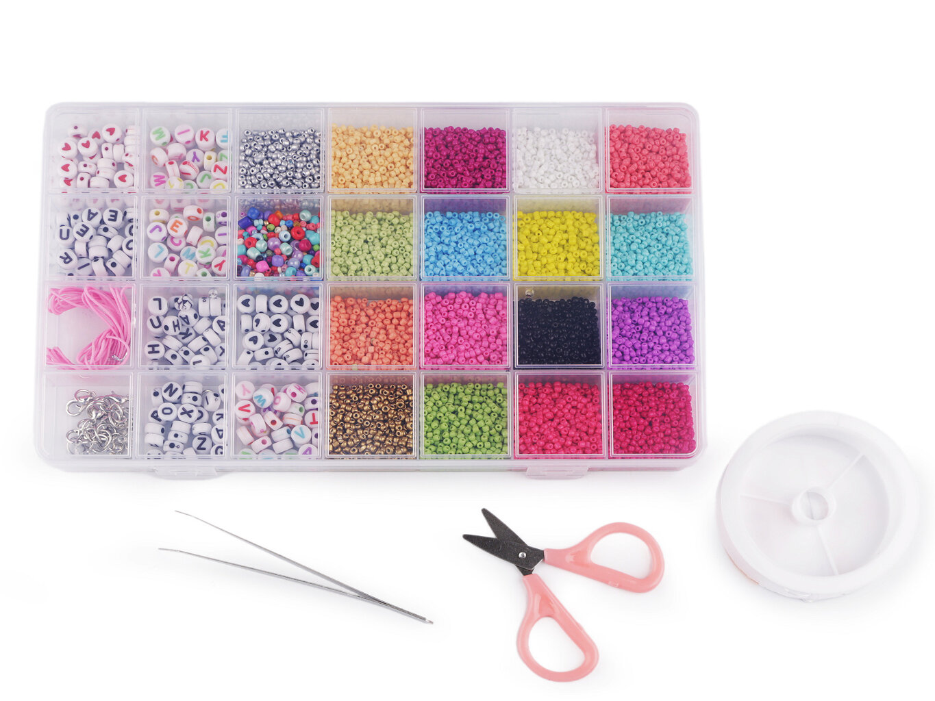 Krásná sada plná korálků rokajl, barevných korálků a pomůcek pro korálkování, vytváření náhrdelníků, náramků a dalšího kreativního tvoření. Korálky přehledně uložené v boxu.