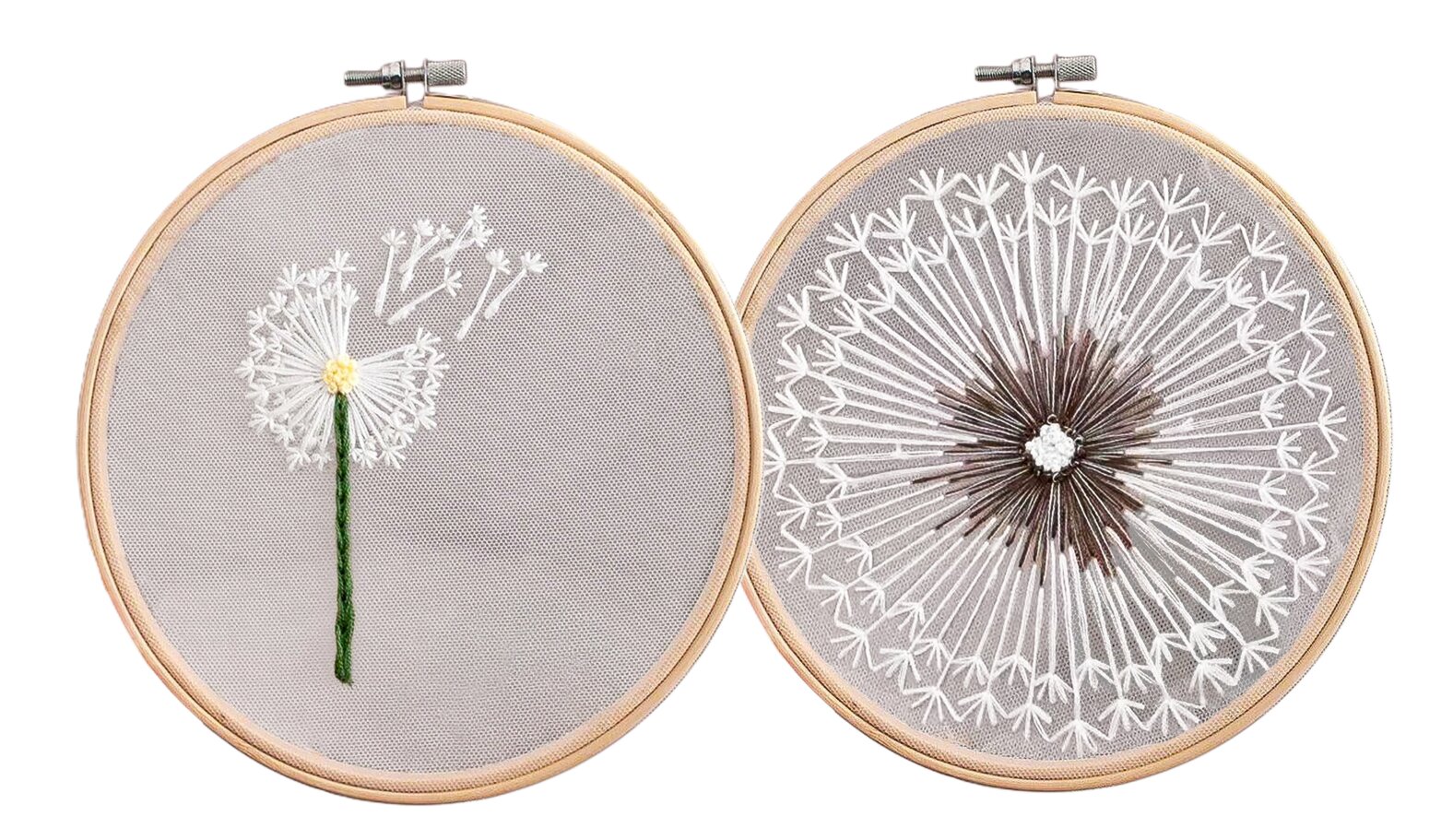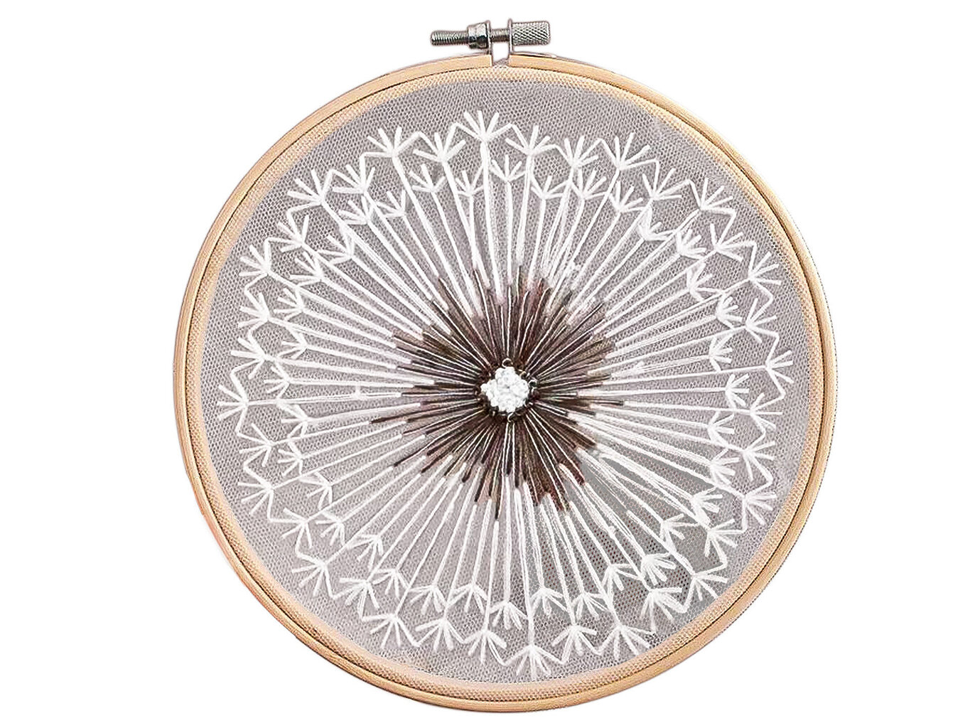Sada na vyšívání s předlohou obsahuje vše, co potřebujete, pro vytvoření nádherné výšivky pampelišky na tylovém základu.