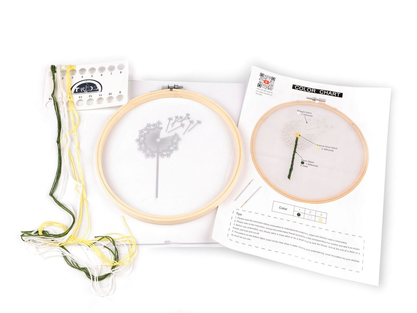 Dokonalá sada se kterou Vám půjde vyšívání od ruky. Obrázky pampelišky vyšíváte na průhledný tyl, výsledkem jsou pozoruhodné obrazy. V sadě najdete tkaninu s předlohou, sadu barevných moulinek, vyšívací jehlu a bambusový kruh, který poslouží rovnou jako rámeček na hotový obrázek.