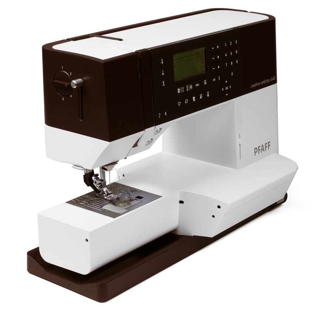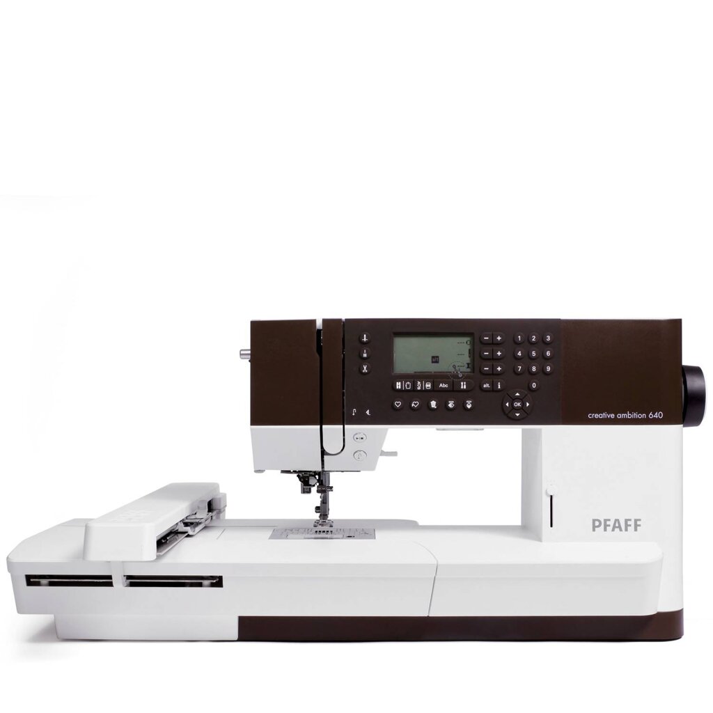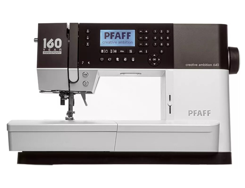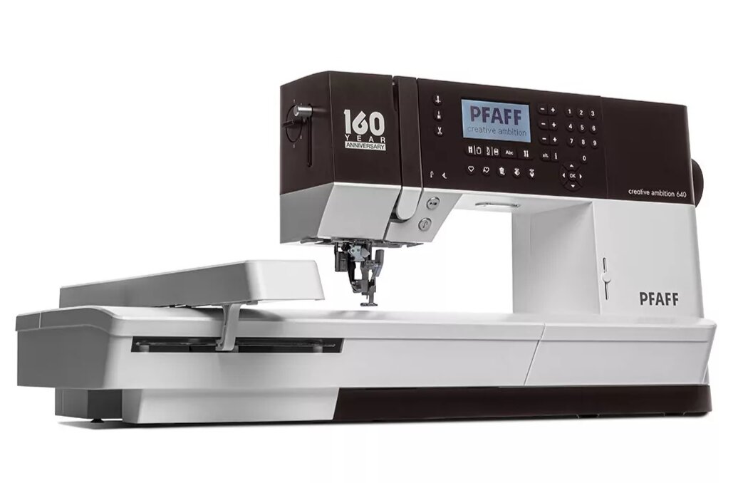 Šicí a vyšívací stroj Pfaff Creative Ambition 640 + vyšívací jednotka je šicí, vyšívací a quiltovací stroj s vyšívací plochou 240 x 150 mm, je určený pro vyšívání i klasické šití. Stroj nabízí 450 šicích programů vč. 2 abeced, 101 vy